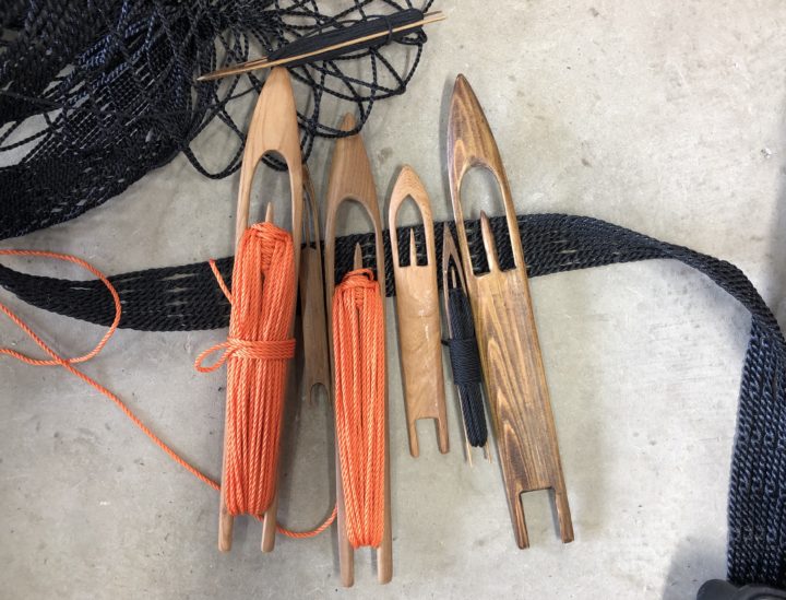 定置網漁の漁師は、漁に出られない雨の日に、魚網の補修をするという。魚網自体は工業的に作られるが、破けた箇所を直したり、複数の網をまとめて大きな網をつくるような仕事は、手で行う。網針(あばり)と呼ばれる道具に糸を巻きつけ、網の間をくぐらせながら、網目をつくり、面を生む。漁師たちの厚い手がもくもくと動き、魚網が編まれていく。網針は、自分の手に合うように竹や木を削って手製する者が多いという。