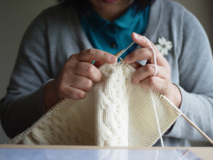 私自身は、編み物はさして上手くない。下手の横好きで自分や家族のものは編むけれど、指の動きはぎこちなく、編み地はガタガタだ。だからこそ、ベテランの編み手の手元を眺めていると、ただただ見惚れる。両手の十指がそれぞれ独立して動き、糸を送り、編み目をつくり、針の奥へと押し進める。流れるような動きで糸は編まれ、面を形成してゆく。熟練者が編んでいると、まるで糸の方が人になついて、手の中でするすると形を変え、自ら進んで編み地になっていくようにすら見える。「糸に愛されている」という言葉に納得するのは、日ごろからそんな光景を見ているからかもしれない。