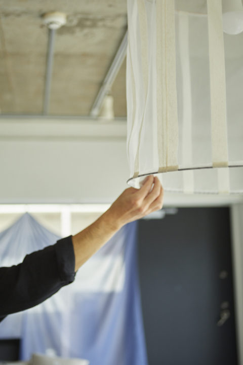 彼がつくる布は、140×230cmのワンサイズ。暮らしの中のどんなシーンにも使えるサイズ感だ。例えばカーテンとしての使い方は、窓の高さに合わせて折ってクリップで留めるだけ。カーテンよりずっと気軽なのに、どんな窓にもちょうどよく馴染む。